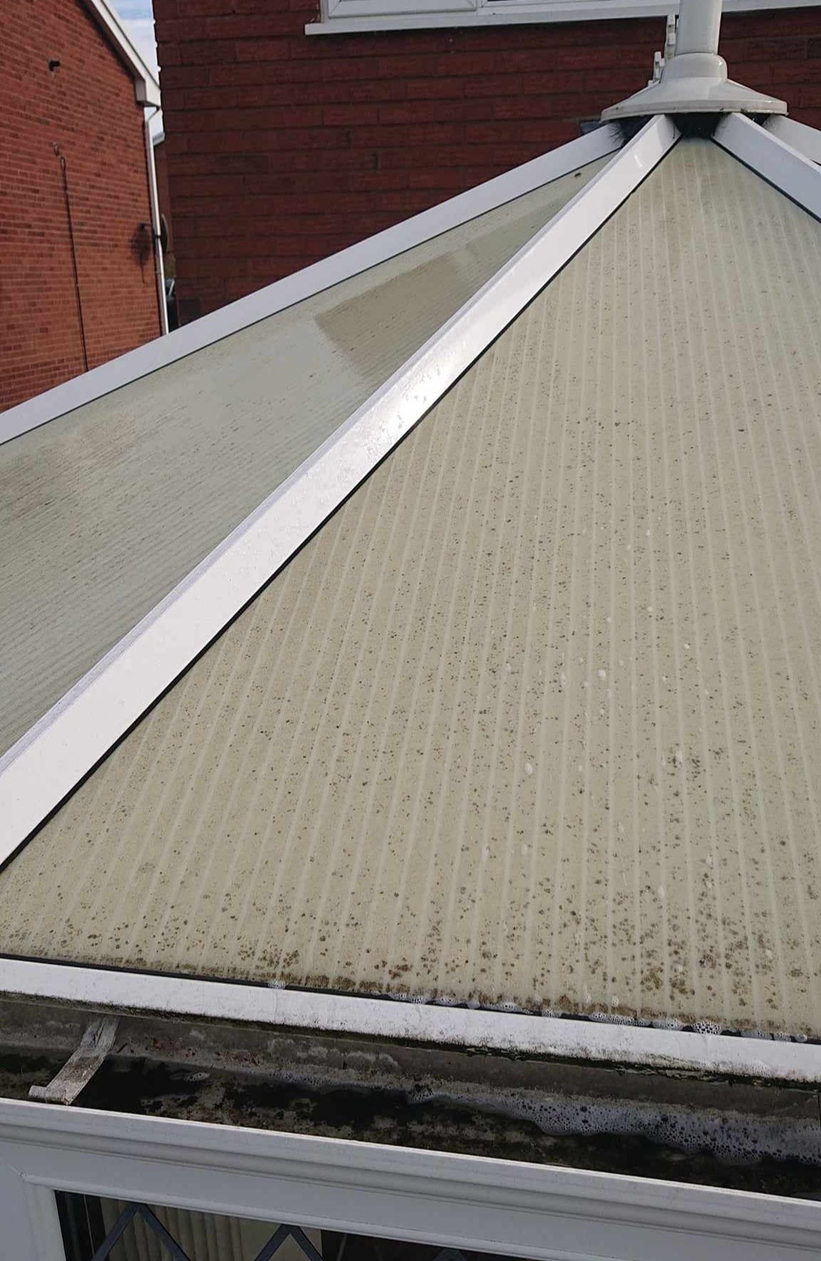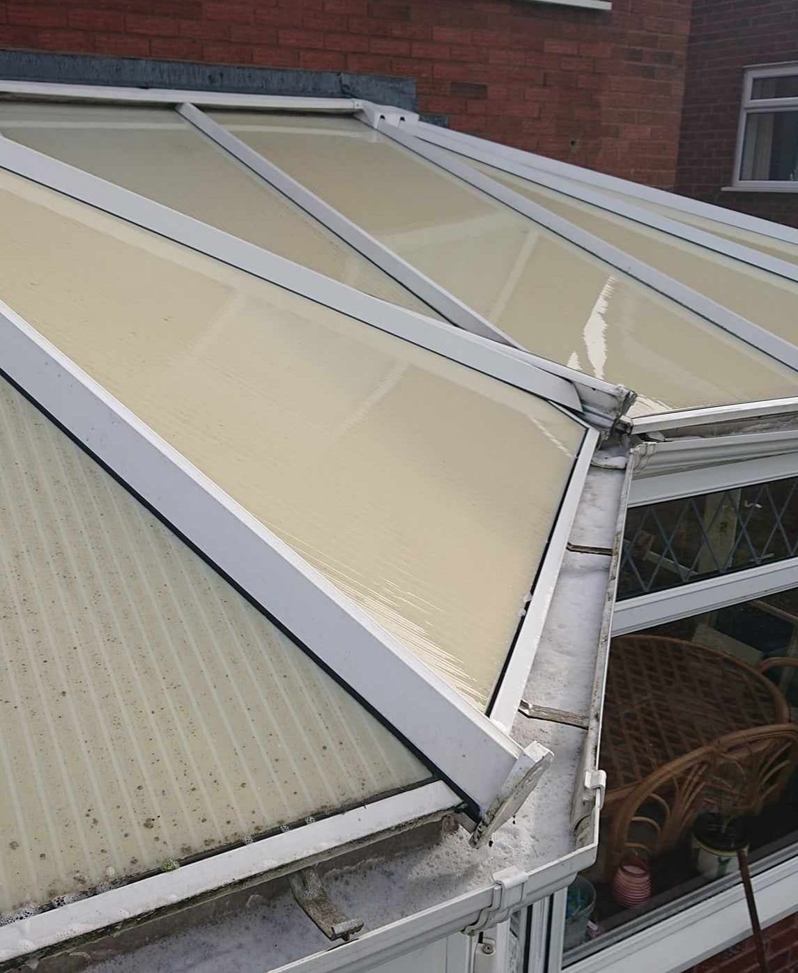 We clean the roof, glass panels, frames, and sills—removing dirt, algae, and staining for a clear, refreshed look.